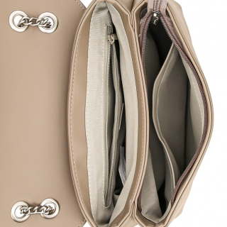 Женская сумка с двумя ручками-цепочками на плечо. Материал верха - экокожа премиум качества. Материал подкладки - полиэстер. Два отделения: одно на молнии, второе без застежки. Внутри: карман для мелочей на передней стенке и карман на молнии на задней стенке. Снаружи: карман на молнии сзади. Цвет фурнитуры - серебро.