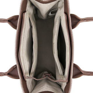 Женская сумка с двумя ручками и регулируемым ремнем на плечо. Материал верха - экокожа премиум качества. Материал подкладки - полиэстер. Одно отделение на молнии. Внутри: карман для мелочей на передней стенке и карман на молнии на задней стенке. Цвет фурнитуры - под цвет материала.