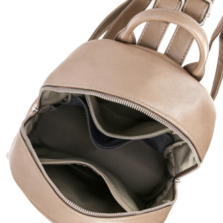 Рюкзак женский городской маленький с ручкой и регулируемыми ремнями. Материал верха - экокожа премиум качества. Материал подкладки - полиэстер. Одно отделение на молнии. Внутри: карман для мелочей на передней стенке; карман для мелочей и карман на молнии на задней стенке. Снаружи: карман на молнии спереди и карман на молнии сзади. Цвет фурнитуры - серебро.