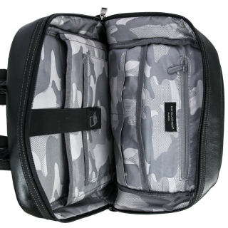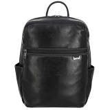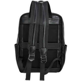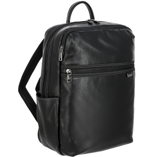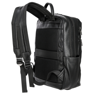 Мужской городской рюкзак с ручкой и регулируемыми ремнями. Материал верха - экокожа премиум качества. Материал подкладки - полиэстер. Одно отделение на молнии. Внутри: три кармана для мелочей на передней стенке, в том числе один на молнии; отделение для планшета/ноутбука и карман для мелочей на задней стенке. Снаружи: два кармана на молниях спереди; карманы сбоку; лямка для крепления на чемодан сзади. Цвет фурнитуры - темное серебро.