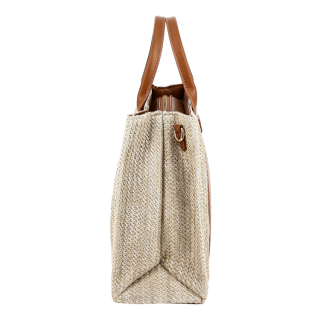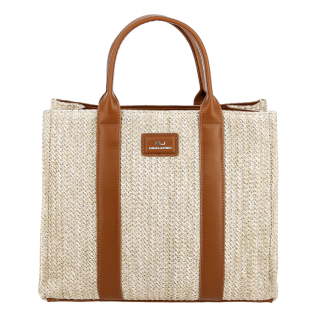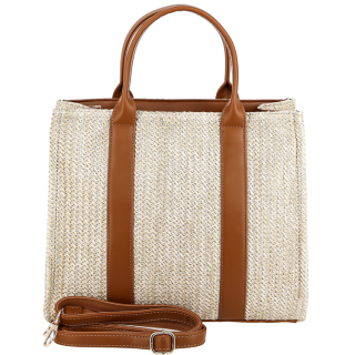 Женская сумка с двумя ручками и регулируемым ремнем на плечо. Материал верха - плетеный материал, экокожа премиум качества. Материал подкладки - полиэстер. Одно отделение на молнии. Внутри: карман для мелочей на передней стенке и карман на молнии на задней стенке. Цвет фурнитуры - золото.