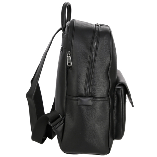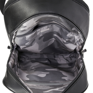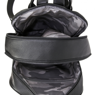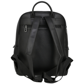 Рюкзак женский городской с ручкой и регулируемыми ремнями, для документов, формат А4. Материал верха - экокожа премиум качества. Материал подкладки - полиэстер. Два отделения на молниях. Внутри: карман для мелочей на передней стенке и карман на молнии на задней стенке. Снаружи: карман на замочке спереди и карман на молнии сзади. Цвет фурнитуры - черный + серебро.