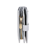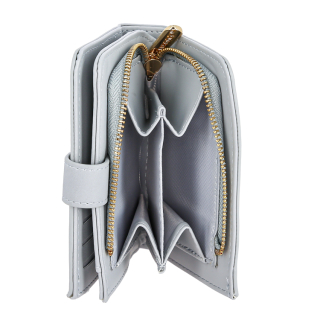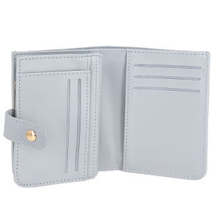Женское портмоне с одним отделением на кнопке. Материал верха - экокожа премиум качества. Материал подкладки - полиэстер. Внутри: перегородки, отделения для монет и пластиковых карточек. Цвет фурнитуры - золото.